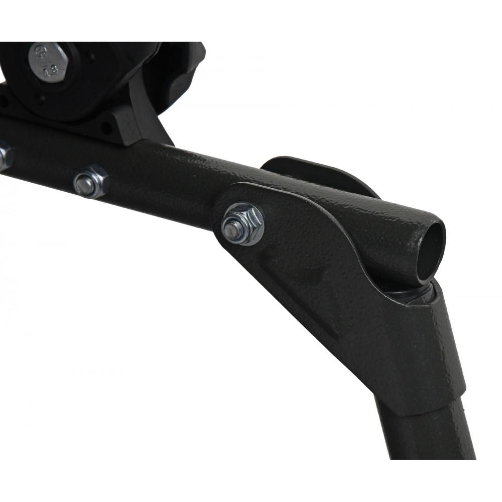 Naslon se jednostavno podešava pomoću bočnih šrafova, dok se sve četiri noge mogu teleskopski prilagoditi, što omogućava stabilno postavljanje i na neravnom terenu. Noge su opremljene širokim blatnim stopama koje sprečavaju propadanje u meko tlo i povećavaju stabilnost.